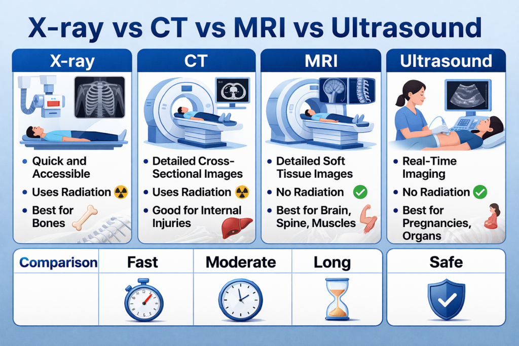 X-ray is best for bones and quick diagnosis. CT scans provide detailed organ imaging. MRI offers superior soft tissue evaluation, while Ultrasound is ideal for safe, real-time imaging.